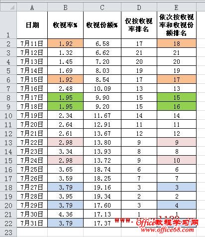 在Excel中对某列进行排名时通常使用RANK函数,但有时排名需要考虑多列的情况,例如在对B列排名时,如果B列有相同的数值,则按C列排名。通常,要获得这样的多列排名结果,可以在“排序”对话框中依次选择或添加“主要关键字”和“次要关键字”,然后进行排序即可。但在不改变表格结构的情况下,要获得“多关键字”的排名,可以用下面的一些公式。 例如下图为某电视节目在播出日期内的收视率和收视份额,需要用公式返该日期内按收视率的降序排名,在收视率的排名相同时,则按收视份额降序排名。其中D列为直接使用RANK函数对B列排名的结果,可以看到,B列数值相同时,其排名也是相同的,不符合要求。 假如数据在A1:E22区域,在E2中输入公式: =RANK(B2,B$2:B$22)+SUMPRODUCT(N((B$2:B$22=B2)*(C$2:C$22>C2))) 然后向下填充公式即可得到先按B列后按C列降序的排名结果。 上述公式先用RANK函数获得初步的排名,对于B列数值相同的情况,用SUMPRODUCT函数得到这些相同值对应C列数值的“排名”,最后返回所需结果。也可使用下面的两个公式: =SUMPRODUCT(N((B2*1000+C2)<(B$2:B$22*1000+C$2:C$22)))+1 该公式将B列的数值乘以一个相对同行C列数值较大的数,如本例为“1000”,再加上同行C列的值,最后比较合计值得到排名。类似地也可以用C列除以一个较大数值: =SUMPRODUCT(N((B2+C2/1000)<(B$2:B$22+C$2:C$22/1000)))+1 另外,如果用于排名的数值都为非负整数,可用“&”连接各列数值,再用SUMPRODUCT函数排名。如下图A1:E21区域为某公司年终考核的数据,要求先按总分列降序排名,如果总分相同,则依次按“业务能力”和“工作态度”列降序排名。 在F2中输入公式: =SUMPRODUCT(N(E2&B2&C2<(E$2:E$21&B$2:B$21&C$2:C$21)))+1 然后填充公式到F21即可 |