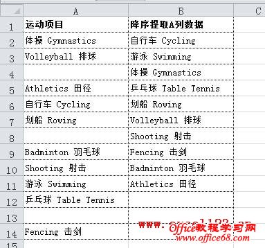 在Excel中要按降序或升序排列某列数据,通常只需对其排序即可。在不允许改变表格结构的情况下,对于数值类型的数据可用LARGE、SMALL等函数来提取,如公式“=LARGE($A$1:$A$20,ROW(A1))”。对于文本则无法直接使用LARGE函数,因为LARGE函数不支持文本,这时可用下面的数组公式。 假如A2:A14中包含一些文本和空单元格,要将其中的文本按字母顺序降序提取到B列,如图所示。 在B2单元格中输入数组公式: =OFFSET($A$1,MATCH(LARGE(COUNTIF($A$2:$A$14,"<="&$A$2:$A$14),ROW(A1)),COUNTIF($A$2:$A$14,"<="&$A$2:$A$14),),)&"" 公式输入后按Ctrl+Shift+Enter结束,然后填充公式到B14单元格,即可得到与降序排序完全相同的结果。 公式说明: 1.“COUNTIF($A$2:$A$14,"<="&$A$2:$A$14)”比较A2:A14中每个文本,并返回一个数组,本例为“{8;5;0;1;10;6;0;2;4;9;7;0;3}”,其中的每个数字对应各自文本,空单元格返回“0”。如“体操 Gymnastic”对应数字“8”,表示A2:A14中小于等于该文本值的数量为8个。 2.LARGE函数按从大到小的顺序(降序)依次提取上述数组中的各个数值,MATCH函数得到该数值在数组中的位置,最后用OFFSET函数提取文本。由于空单元格会返回“0”,在公式的末尾加上“&""”将其转换为空。 3.要按字母顺序升序提取文本,将公式中的“<”改为“>”,如在B2中输入公式: =OFFSET($A$1,MATCH(LARGE(COUNTIF($A$2:$A$14,">="&$A$2:$A$14),ROW(A1)),COUNTIF($A$2:$A$14,">="&$A$2:$A$14),),)&"" |