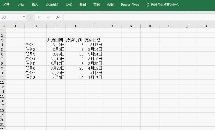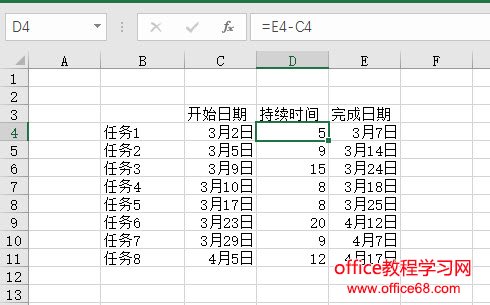 首选我们需要把任务的计划开始日期和结束日期确定好。并利用减法算出他们的天数。
