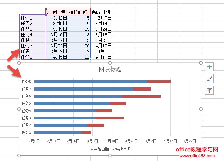 然后选中B3:D11区域,注意不要选中完成日期列,插入一个堆积条形图。请看动图操作: