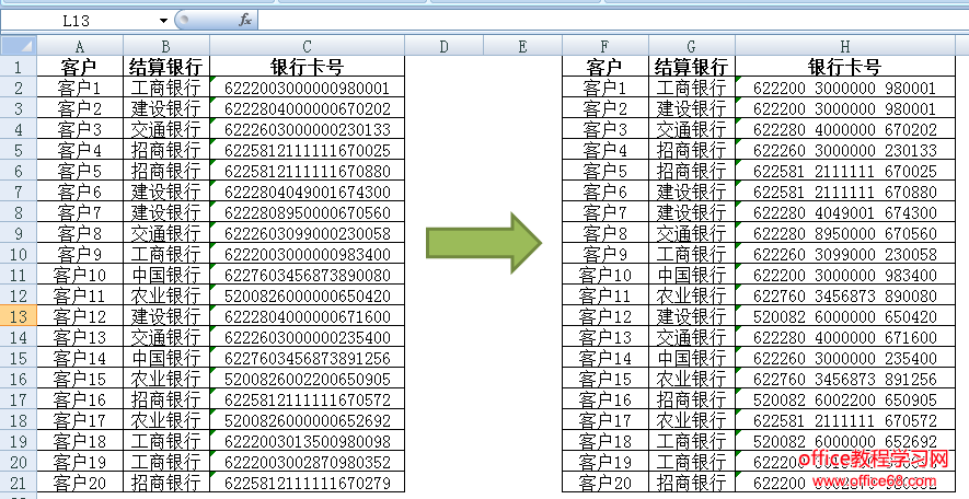 选中C列,按ctrl+1组合键,调出设置单元格格式设置对话框,在自定义类型栏目输入:000 0000 0000,最后点击“确定”,则完成任务。看↓↓↓