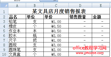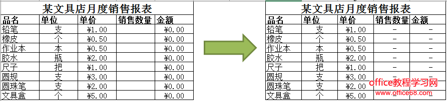 如下图所示,有一张某文具店月度销售报表模板,销售数量是需要手工录入的单元格,金额是带公式的单元格。现在老板不知是看了哪家公司报表,突然提出要用横杠来代替公式或零值的单元格显示的想法,以显得我们也比较专业。
