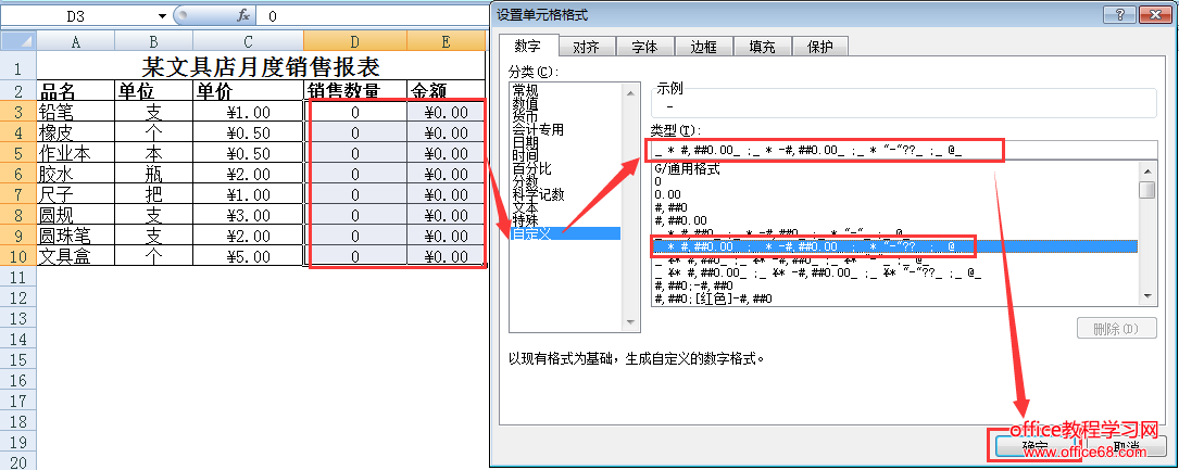 (2)然后选中下图中所有的“0”单元格,然后按Ctrl+1打开单元格格式设置,在自定义处,选择下图中系统自带的格式类型。格式代码为:_ * #,##0.00_ ;_ * -#,##0.00_ ;_ * "-"??_ ;_ @_