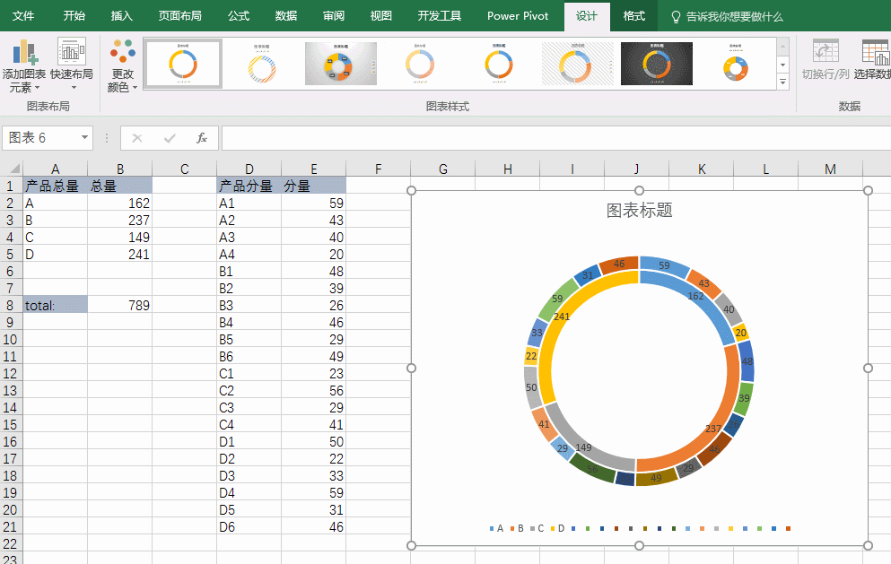 多层环形图就这样做好了,实际上环形图可以做很多层,只要数据够全。细心的朋友肯定发现了,总Total:789好像这个数据没用上嘛?实际上这是牛闪闪接下来要教大家做饼环图用到的。什么是饼环图呢?其实就是环形图的中心部分是个饼图而已,怎么来制作呢?方法也很简单,我们接着之前做好的多环图继续操作。