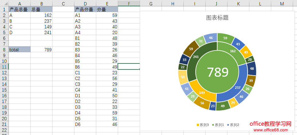 注意操作细节,思路是加载789的总Total到图表中,利用箭头调整环形的顺序,然后将最里面的环形改为饼图即可。最终效果如下: