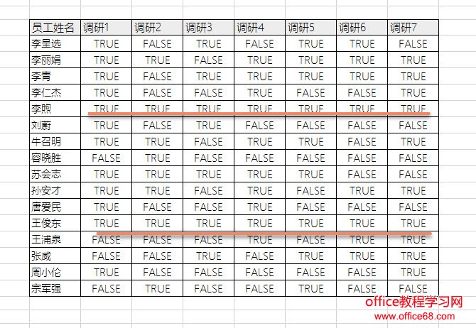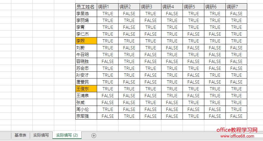判断完毕后,就会发现如果和基准表单元格一样,那么所有调研对应单元格都是TRUE。看下图红线处。