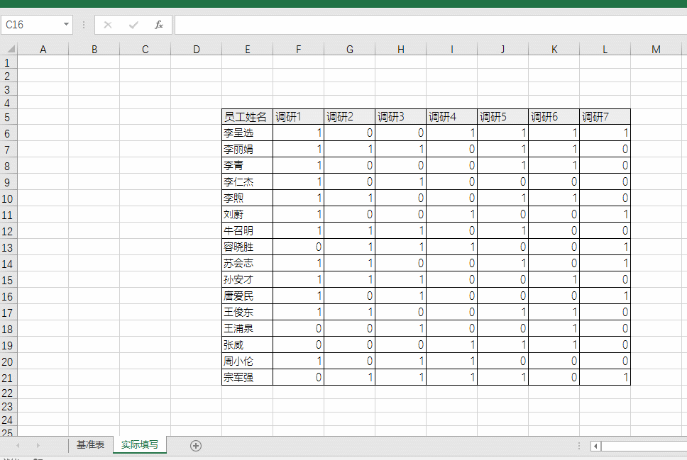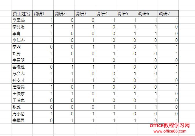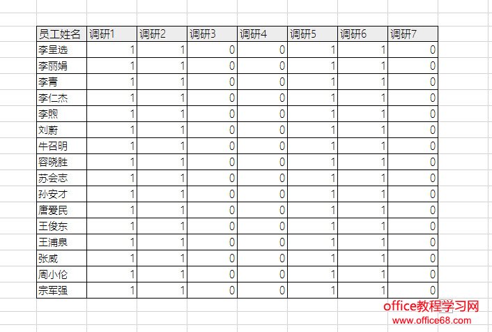 制作过程如下: 调研表的结构大致如下,左侧人名,上次是调研的题目,下面是选项,输入选择1或0,表示答案的正确。