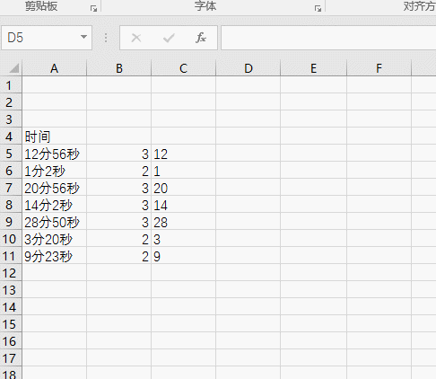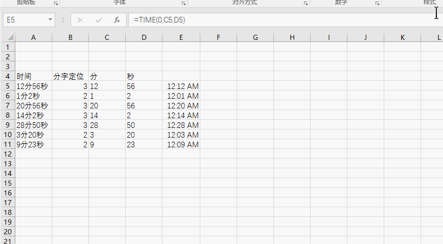 =TIME(0,C5,D5) 由于没有小时数,所以定义了分和秒。