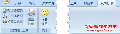 说明:上述代码中“<tab id="MyTab" label="双面打印">”表示自定义的选项卡名称为“双面打印”,“<group id="zu1" label="双面打印工具">”表示控件组的显示名称为“双面打印工具”,“<button id="anniu1" label="打印奇数页" size="normal" onAction="OddPagePrint" imageMso="PrintAreaMenu" /> ”行定义了一个按钮,名称为“打印奇数页”,按钮图标为Excel 2007内置图标“PrintAreaMenu”,图标大小为普通大小,单击按钮将调用VBA中的"OddPagePrint"过程。通过上述代码,我们定义了如图一所示的自定义功能区。因为上述代码中含有中文字符,所以必需将编码改为“Unicode”,如果只有英文字符,可以不改编码。