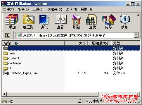 Office 2007新的文件格式采用了基于XML的文件格式,新的Office Open XML格式的核心使用一些XML的引用架构和一个ZIP容器,其实就是一个ZIP压缩包。所以我们可以用压缩软件(如WinRAR)打开它,然后通过添加、修改其中文件的方法实现自定义功能区的目的。上面的customUI文件夹必须放入其中才能起作用,另外还必须修改其中“_rels”文件夹中的“.res”文件进行关联,具体步骤如下: