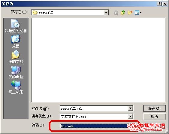 在桌面上新建一个文件夹,命名为“customUI”,然后在该文件夹中新建一个文本文件,将文件名改为“customUI.xml”,注意扩展名为“xml”,而不是“txt”。右击该文件,选“编辑”打开(或用记事本打开),输入下列内容:
