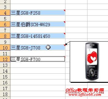 2.在单元格中输入产品名称,如“三星SGH-F258”、“三星SGH-F700”等,名称必需和图片名称相对应。