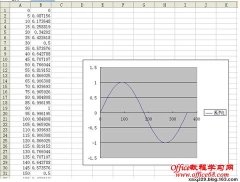 ⑹把鼠标置于B1单元格,用填充柄把与A列单元格对应的正弦函数值全部求出来。在A列和B列的对应值都求出来以后,下一步就是画曲线了;