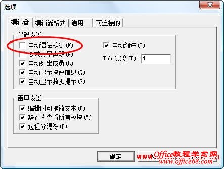 当在VBA编辑器代码窗口中输入有语法错误的语句时,默认VBA编辑器会弹出一个错误提示对话框,同时将错误语句显示为红色,这对于初学者可以起到很好的提醒作用。例如输入语句 if range("A1") 就立即回车,VBA编辑器会提示编译错误“缺少:Then或GOTO”。 但有时语法错误并非无意造成的,例如当一行语句未输入完毕,就需要转到下一行继续输入其他语句。在这种情况下可以关闭自动语法检查功能,让VBA编辑器不再弹出错误提示对话框。设置方法如下: 1.在VBA编辑器中,单击菜单“工具→选项”,弹出“选项”对话框。 2.选择“编辑器”选项卡,取消选择“自动语法检测”选项。 3.单击“确定”按钮。 这样设置后,对于有语法错误的语句,回车后VBA编辑器虽不会弹出错误提示对话框,但仍会将其显示为红色 |