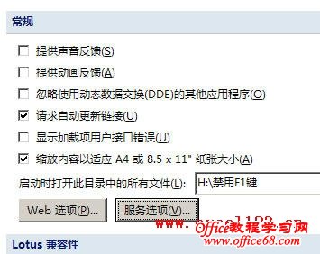 2.单击“Office按钮→Excel选项→高级”,在“常规”下的“启动时打开此目录中的所有文件”中输入上述工作簿文件所在的文件夹路径,如“H:\禁用F1键”,单击“确定”。