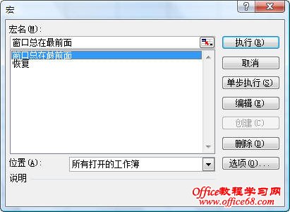 4.选择宏名“恢复”并运行将取消窗口总在最前面的设置