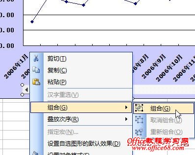 根据需要和喜好对图表的分类轴和数值轴字体以及图表区的颜色进行修改,并适当调整绘图区的大小,将滚动条拖到图表中的适当位置。同时拖动滚动条周围的句柄,调整滚动条的高度和宽度。选中滚动条,然后按住Ctrl键单击绘图区,这时将同时选中滚动条和图表,在图表区中右击,在弹出的菜单中选择“组合→组合”,将图表和滚动条进行组合。