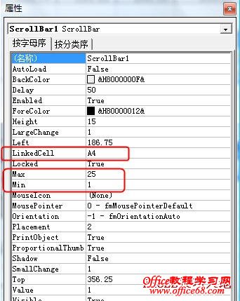添加“LinkedCell”属性值为“A4”,表示滚动条将链接到A4单元格。将“Max”属性值改为“25”,因为图表中最少要显示12个月的数据,因此这里最大值取25,当滚动条拖动到左右侧时,将显示最后一年的数据。将“Min”属性值改为“1”。关闭属性窗口。