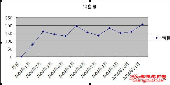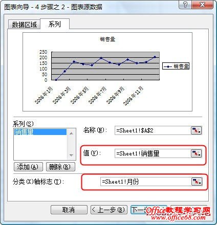 选择数据区域中的任意单元格,单击菜单“插入→图表”,图表类型选“折线图”,使用默认的“数据点折线图”,单击“下一步”按钮,在“图表向导-4 步骤之2-图表源数据”对话框中选择“系列”选项卡,将“值”右侧文本框中的默认值改为“=Sheet1!销售量”,将“分类(X)轴标志”右侧文本框中默认值改为“=Sheet1!月份”,单击“完成”按钮。