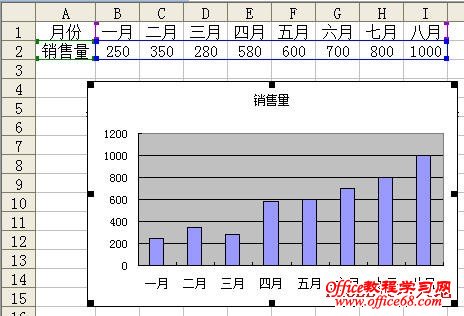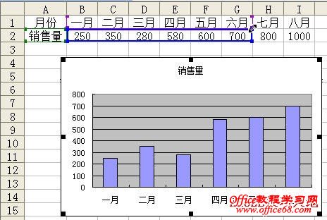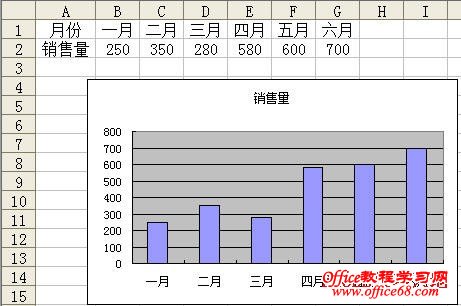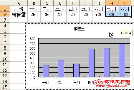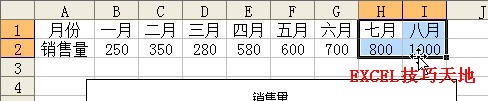 如果有一个每月不断增加数据的图表,可以用下面的方法来快速扩展图表数据区域。如图为1-6月的销售数量图表,现在需要将7-8月数据添加到图表中。
