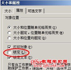 3.弹出“大小和属性”对话框,选择“属性”选项卡,取消选择“锁定”。