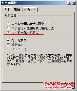 当我们在Excel表格中进行自动筛选时,表格中包含的一些图表、图形或艺术字等对象的大小和位置可能会随着部分行的隐藏而发生变化。另外,当图形图表对象后面的单元格大小发生改变时,对象的大小也会随之改变,这不但影响美观,也不方便查看。 要避免出现这种情况,可以改变图表图形对象的属性设置,方法如下: Excel 2003: 1.选择某个对象,如图表。鼠标右击,在弹出的快捷菜单中选择“设置对象格式”。 2.在弹出的“设置对象格式”对话框中,选择“属性”选项卡。 3.选择“大小、位置均固定”。 4.单击“确定”。 Excel 2007: