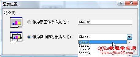 在弹出的“图表位置”对话框中,在“作为其中的对象插入”右侧的下拉列表中,选择“Chart1”,单击“确定”按钮。