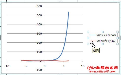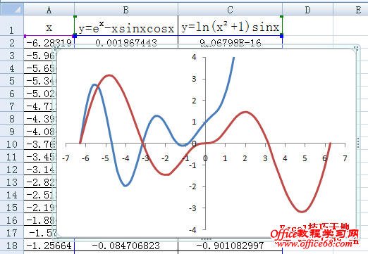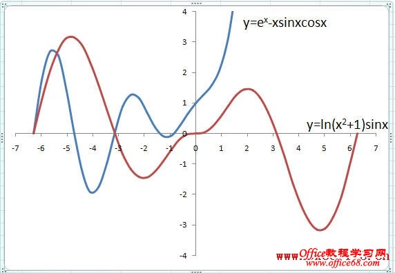 在Excel中可以轻松地绘制出复杂的数学函数图像,还可以将多个函数图像放入同一图表中进行对比。如下图就是在Excel中绘制的两个函数图像: