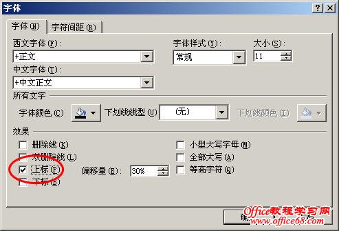 然后在弹出的“字体”对话框中,选择“字体”选项卡,勾选“上标”即可。
