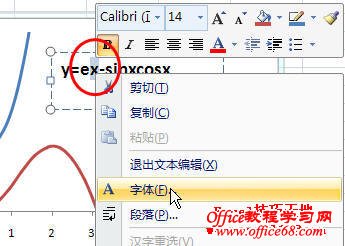 在功能区中选择“插入”选项卡, 在“文本”组中单击“文本框→横排文本框”,然后在图表的绘图区中拖动鼠标画出一个文本框。在文本框中输入函数表达式,并设置适当的字体、字号。对于第一个函数表达式中的指数“x”,可以用设置上标的方法来输入。方法是选择表达式“y=ex-xsinxcosx”中字母“e”后的“x”,鼠标右击,在弹出的快捷菜单中选择“字体”,如下图。