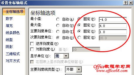 在弹出的“设置坐标轴格式”对话框中的“坐标轴选项”栏目中,将“最小值”、“最大值”、“主要刻度单位”的值设置为“固定”,并在后面的文本框中分别输入“-4”、“4”、“1”,单击“关闭”按钮。