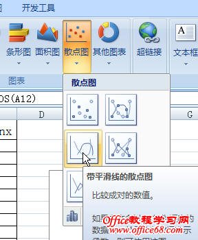 选择A2:C42区域中的任一单元格,在功能区中选择“插入”选项卡,在“图表”组中依次单击“散点图→带平滑线的散点图”。