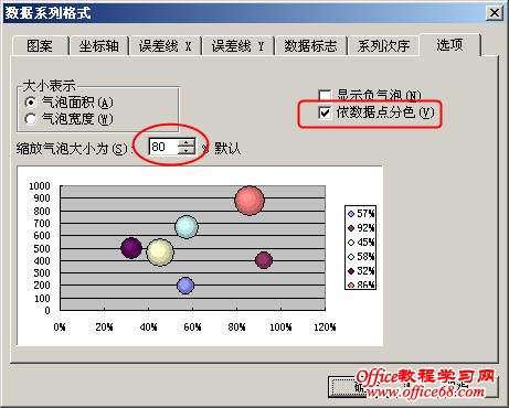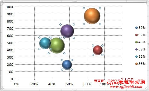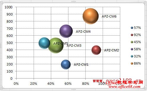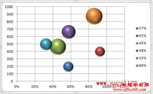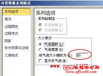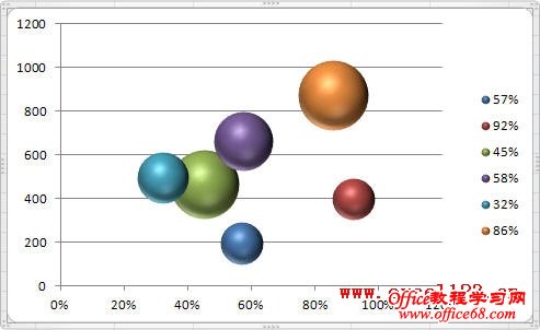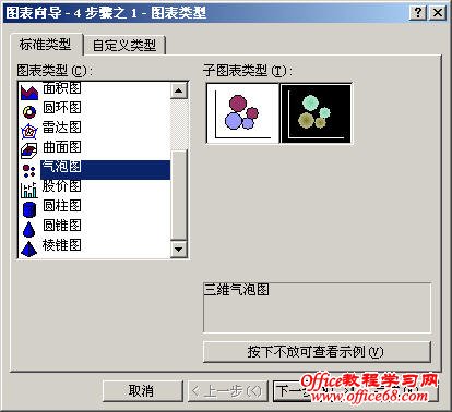 大家知道,Excel中的散点图可以显示两组数据之间的关系,而气泡图则可以显示三组数据之间的关系。气泡图中沿横坐标轴(x 轴)方向显示一组数值数据,沿纵坐标轴(y 轴)方向显示第二组数值数据,而第三组数值数据则用气泡的大小来显示。与散点图一样,其三组数据都必须为数值,不同的是气泡图中的每个数据点都对应三个数据。本文介绍在Excel中制作气泡图的方法以及快速为气泡图的系列数据点添加文本数据标签和快速在气泡图的图例中添加文本的方法。 一、气泡图的基本制作步骤 假如某公司的部分产品有如图所示的三组数据,数据在A1:D7区域中,要用气泡图来显示其销售量、增长率及市场份额三者之间的关系。 Excel 2007/2010: 以Excel 2010为例。 1.选择包含数值的区域,即B2:D7区域。与制作其他图表(如柱形图)不同,制作柱形图时,选择数据区域中的某个单元格再插入图表即可,但在制作气泡图时,如果选择了标题所在的第一行,气泡图中的数据可能显示不正确。 2.在功能区中选择“插入”选项卡,在“图表”组中单击“其他图表”,在“气泡图”下选择“气泡图”或“三维气泡图”,本例选择“三维气泡图”。Excel会在工作表中添加一个气泡图。 3.右击某个数据系列点,选择“设置数据系列格式”,弹出“设置数据系列格式”对话框。在Excel 2010中可直接双击某个数据系列点打开该对话框。选择“填充”,勾选“依数据点着色”,这样给每个数据点设置不同的颜色。 下面的步骤可根据实际需要进行设置。 4.修改或添加网格线。选择图表,在功能区中选择“图表工具-布局”选项卡,在坐标轴组中单击“网格线→主要横网格线→其他主要横网格线选项”,弹出“设置主要网格线格式”对话框,选择“线型”,在“短划线类型”右侧的下拉列表中选择某种线型,如“方点”。 用同样的方法设置主要纵网格线。 5.修改气泡的大小表示。按第3步中的方法打开“设置数据系列格式”对话框,选择“系列选项”,在右侧区域中根据需要选择按“气泡面积”或“气泡宽度”来表示气泡大小,还可将气泡大小按比例缩放。此处将气泡大小缩小为原来的80%。 最后完成气泡图。 Excel 2003: 1.选择包含数值的区域,即B2:D7区域。单击菜单“插入→图表”,弹出“图表向导”对话框。在对话框中选择图表类型为“气泡图”,子图表类型为“三维气泡图”,单击“完成”。 Excel在当前工作表中插入一个气泡图。 2.双击某个数据系列点,弹出“数据系列格式”对话框,选择“选项”,根据需要设置气泡大小,此处将气泡大小缩小为原来的80%,勾选“依数据点分色”,单击“确定”。 3.选择图表,单击菜单“图表→图表选项→网格线”,在“数值(X)轴”下勾选“主要网格线”,单击“确定”。在图表中分别双击“数值(X)轴主要网格线”和“数值(Y)轴主要网格线”,在弹出的“网格线”格式对话框中设置网格线样式。最后根据需要修改图表背景颜色、调整图表大小等。