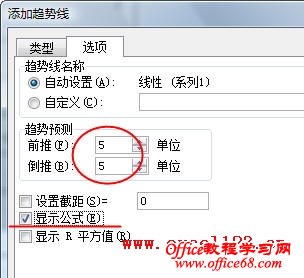 4.右击图中的某个数据点,在弹出的快捷菜单中选择“添加趋势线”,弹出“添加趋势线”对话框,选择“选项”选项卡,在“趋势预测”下设置“前推”和“倒推”为一个合适的数值,本例都为“5”,勾选“显示公式”选项。