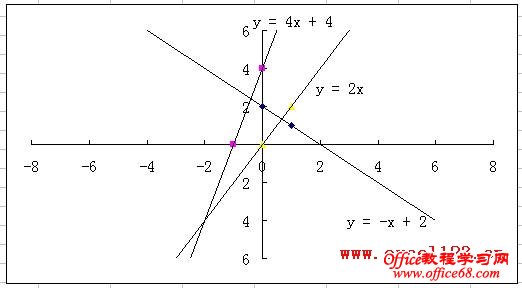 要在Excel中绘制一次函数y=kx+b的图像,可以用先插入散点图,再添加趋势线的方法。本文以在Excel 2003中绘制y=-x+2、y=4x+3和y=2x的图像为例,说明如下: