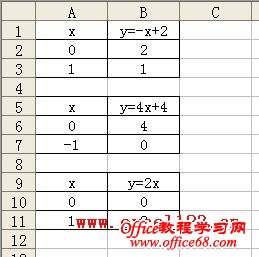 由于两点确定一条直线,因而只需两个数据点即可。在工作表中分别输入三个一次函数的两个数据点,在A列输入x值,在B列输入对应的y值,如图。