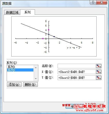 6.添加其他一次函数图像。在绘图区中右击,选择“源数据”,弹出“源数据”对话框,选择“系列”,单击“添加”按钮,Excel会添加一个“系列2”,将“X值”和“Y值”分别设置为A6:A7和B6:B7区域后确定。