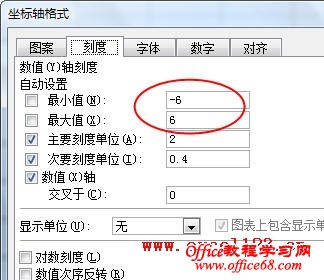 3.为了让两个坐标轴的交点处于图像的中间位置,可进行如下设置。双击“数轴(y)轴”,弹出“坐标轴格式”对话框,选择“刻度”选项卡。将“最小值”和“最大值”设置为一个合适的值,本例为“-6”和“6”。