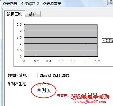 1.选择A2:B3,单击菜单“插入→图表”,选择“xy散点图”类型,单击“下一步”,将“系列产生在”后的选项改为“列”。