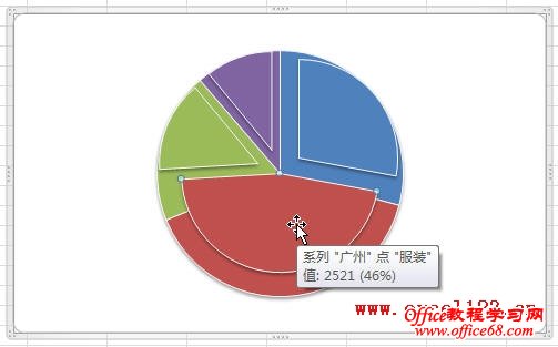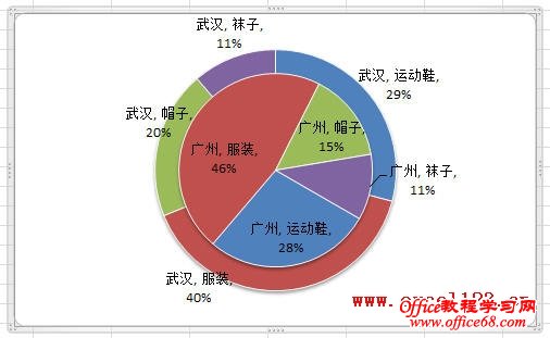 6.最后添加数据标签,并根据需要适当旋转内圈饼图,方法是右击内圈的“广州”系列,在快捷菜单中选择“设置数据系列格式→系列选项”,拖动“第一扇区起始角度”下的滑块使内圈旋转一个角度。完成后的图表如下图。