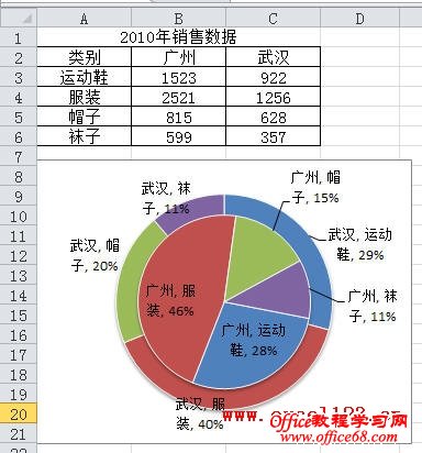 Excel中的饼图可以反映一组数据中各数据点所占百分比,如果要在同一饼图中显示两组数据,可以用双层饼图。本文介绍在Excel 2007/2010中制作双层饼图的方法。假如某服装公司2010年的销售数据如图,需要在一个图表中用饼图显示“广州”和“武汉”两地的销售数据。