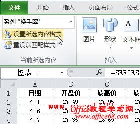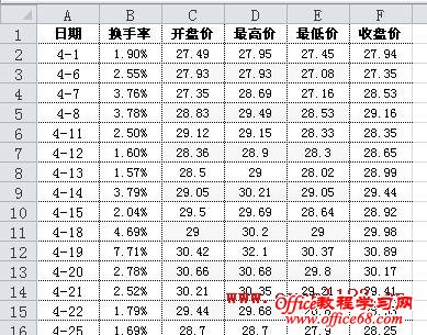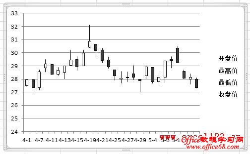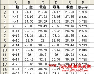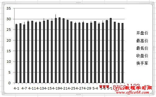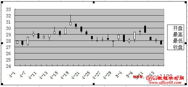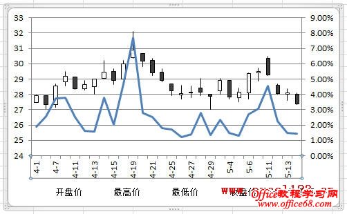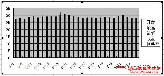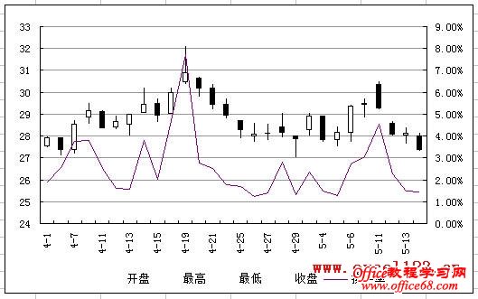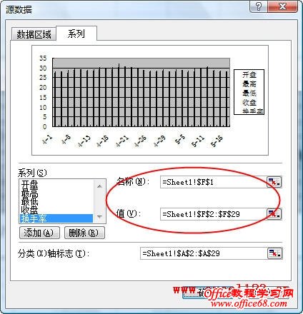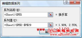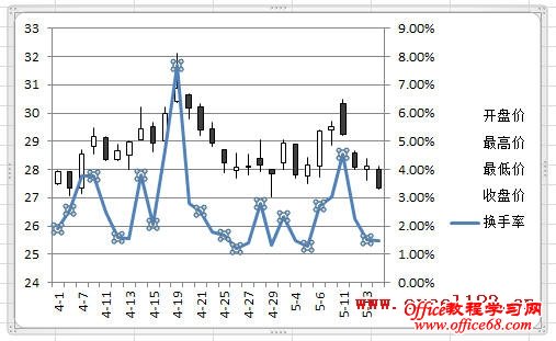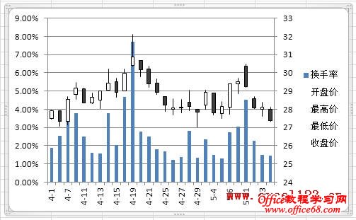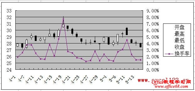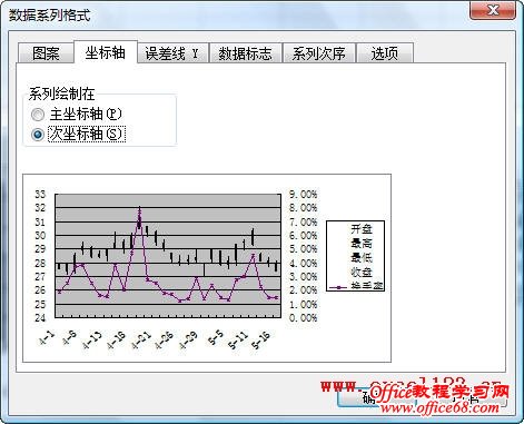 有时需要在Excel股价图中添加一个折线图来对比数据,例如在股价图中加入“换手率”的数据。如图所示,在A1:F29区域中包含某股票的股价数据,其中A-E列分别为开盘、最高、最低和收盘价,F列为换手率数据,需用A-E列数据绘制股价图,并在股价图中添加折线图反映换手率的变化情况。 在Excel 2003和Excel 2010中的实现方法如下: Excel 2003: 1.选择A1:E29区域,单击菜单“插入→图表”,在对话框中选“股价图”,单击“完成”,Excel插入一个股价图。 2.添加“换手率”系列:选择图表,单击菜单“图表→源数据→系列”,在对话框中单击“添加”按钮,将“名称”设置为F1单元格,将“值”设置为F2:F29区域。 3.单击“确定”关闭对话框,此时股价图变为如图所示。 4.反复按上下箭头键,当左上角的名称框中出现“系列‘换手率’”时,双击图表中已选择的“换手率”系列,弹出“数据系列格式对话框”。选择“坐标轴”选项卡,将“系列绘制在”选项修改为“次坐标轴”。 单击“确定”,即可得到所需的折线图。 4.最后根据需要修改图表中的坐标轴字体、删除绘图区背景、更改图例位置。 Excel 2007/2010: Excel 2010为例,本文介绍两种添加折线图的方法。 方法一:用“开盘-盘高-盘低-收盘图” 1.选择A1:E29区域,在功能区中单击“插入→其他图表”,在“股价图”中选择第二个“开盘-盘高-盘低-收盘图”。 Excel插入一个股价图: 2.在“图表工具-设计”选项卡的“数据”组中单击“选择数据”,弹出“选择数据源”对话框,单击“添加”按钮,将“系列名称”设置为F1单元格,将“系列值”设置为F2:F29区域。 单击两次“确定”,股价图变为如图所示。 3.在Excel 2007/2010中,不能在上述股价图中直接更改新增系列的图表类型,如将新增系列的图表类型更改为折线图,Excel会提示“部分图表类型不能与其他图表类型组合”,如图所示: 这时可通过下面的方法进行设置。在“图表工具-布局”选项卡中的“当前所选内容”组中选择“系列‘换手率’”,并单击其下方的“设置所选内容格式”。 弹出“设置数据系列格式”对话框,在“系列选项”中,设置“系列绘制在”选项为“次坐标轴”,在“线条颜色”中,设置“线条颜色”为“实线”。 这时的股价图如下: 4.最后根据需要对图表进行调整,如将图例放置与图表底部、调整水平轴文字的对齐方式等。 方法二:用“成交量-开盘-盘高-盘低-收盘图” 这种方法需要按指定的顺序排列数据,即需要将“换手率”列放置在“开盘价”和“日期”列之间,如图。 步骤如下: 1.选择股价数据中的某个单元格,选择“插入→其他图表→股价图”,此处选择第四个子图表类型“成交量-开盘-盘高-盘低-收盘图”。 得到如下的图表: |