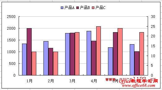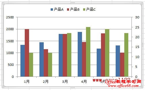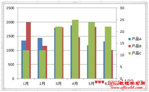 如果系列C为折线图,直接将“产品C”系列绘制在次坐标轴中即可。但本例需将“产品C”与其他两个系列一样绘制为柱形图,将其绘制到次坐标轴后,该系列柱形会与主坐标轴的两个柱形重叠在一起,并遮住其他两个柱形,如图。
