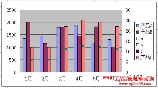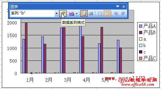 3.将“b”、“c”和“产品C”系列设置到次坐标轴。方法是:先在“图表”工具栏中选择“系列b”,如果“图表”工具栏没有显示,可右击工具栏,选择“图表”让其显示出来。然后单击“图表”工具栏中的“数据系列格式”按钮。