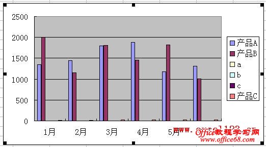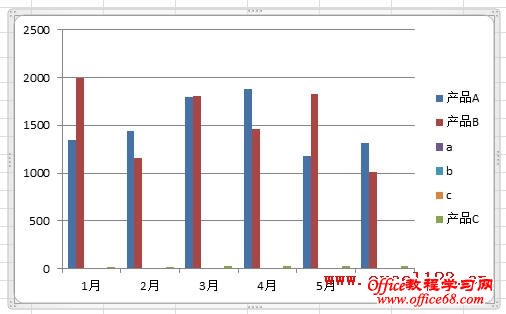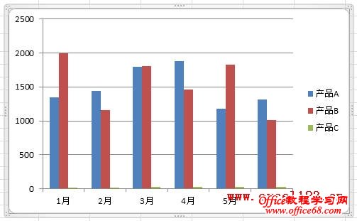 如果直接用柱形图来显示数据,会出现“产品C”系列在图表中几乎看不到的情况。