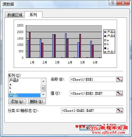 再按上述方法添加另两个值为“0”的系列“b”和“c”。最后添加“产品C”系列,方法是单击“添加”,将“名称”设置为D1单元格,将“值”设置为D2:D7区域。这三个系列将在下面的步骤中被设置到次坐标轴。