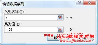 2.在“图表工具-布局”选项卡的“数据”组中单击“选择数据”,弹出“选择数据源”对话框,单击“添加”按钮。给新增的系列设置一个名称,本例为“a”,将“系列值”中的“1”改为“0”,如图,单击确定。