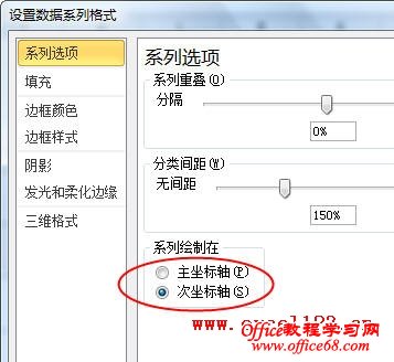 然后在“数据系列格式”对话框中选择“坐标轴”选项卡,将“系列绘制在”设置为“次坐标轴”后确定。