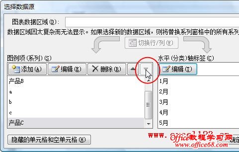 3.在“选择数据源”对话框中选择“产品C”,按“删除”按钮右侧的向下三角形箭头将其移到“系列c”的下面。