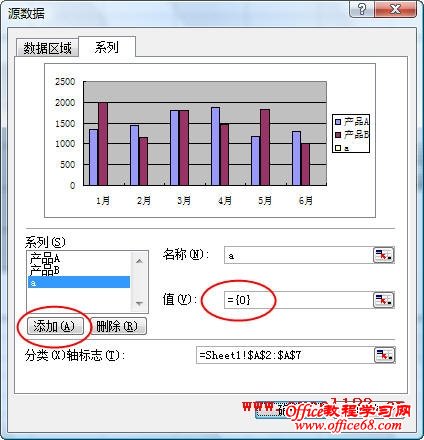 2.单击菜单“图表→源数据”,弹出“源数据”对话框,单击添加按钮。在“名称”右侧的文本框中输入一个名称,本例为“a”,在“值”右侧的文本框中将“={1}”改为“={0}”。